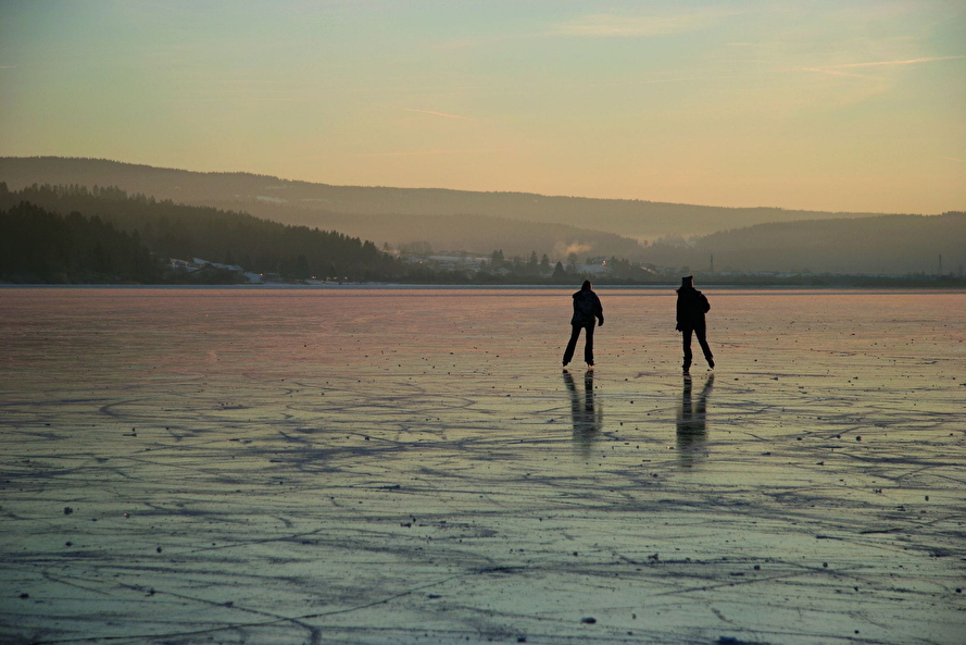 Couple de patineurs sur l'immense lac Saint-Point gelé