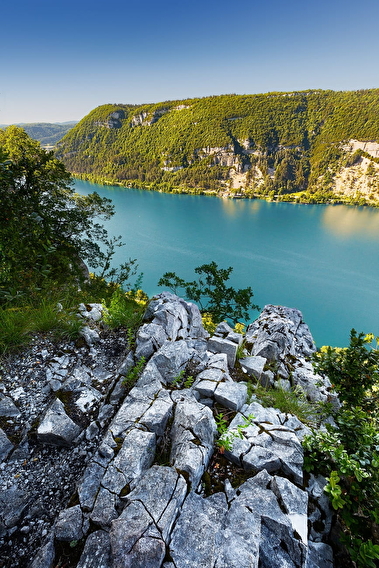 Le lac de Nantua entouré par les contreforts du massif du Jura