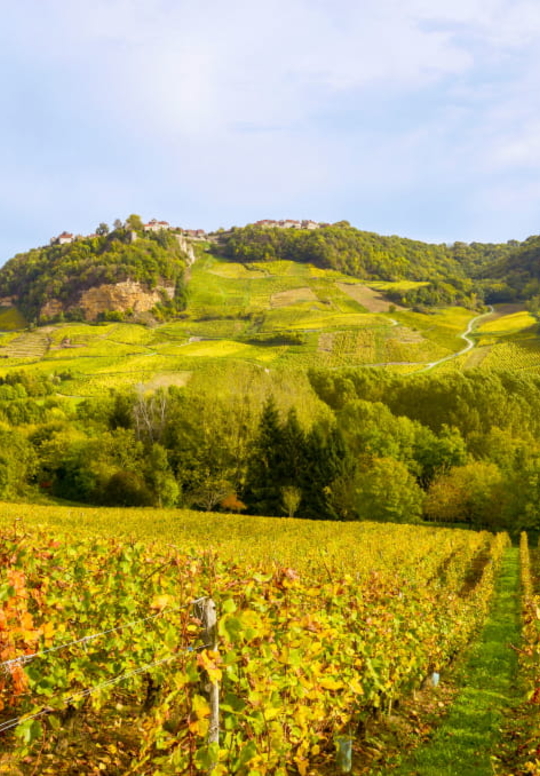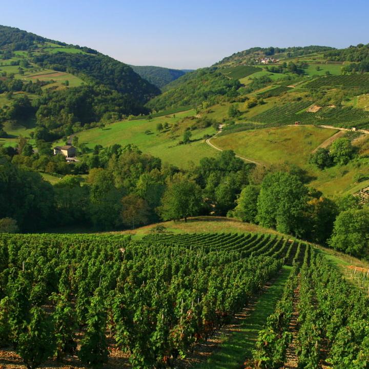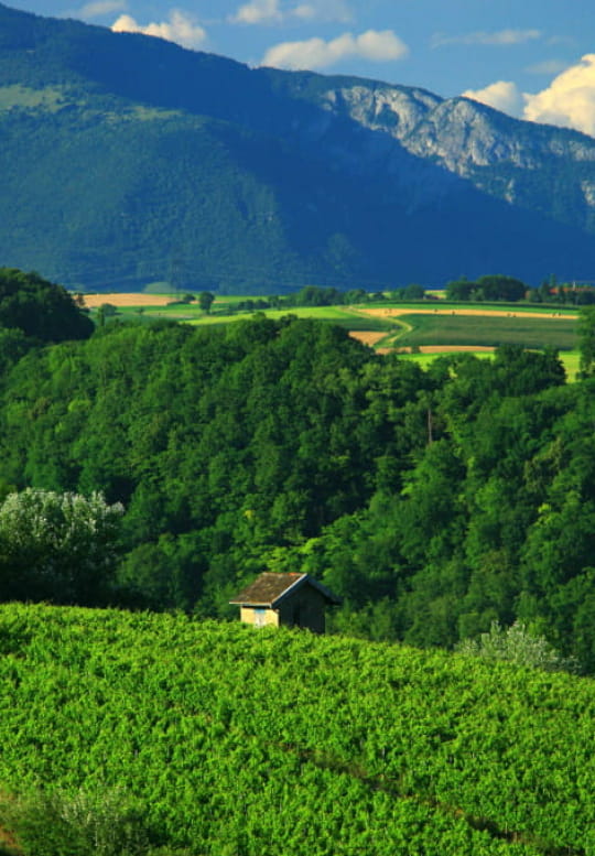 Sur les premiers contreforts du Jura, au cœur de paysages grandioses, les rangs de vignes habillent les pentes entre falaises abruptes, vallées vertes encaissées et villages de charme.