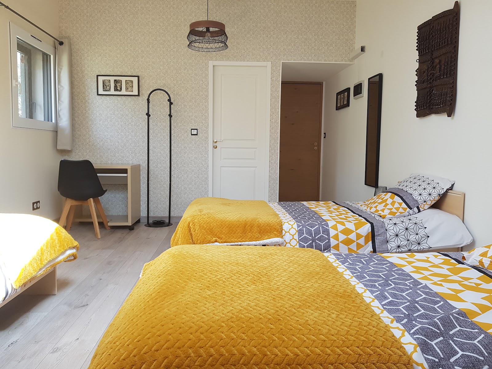 Situé au 1er étage dans grand bâtiment où habite les propriétaires, vous entrerez dans un grand appartement avec cuisine équipée ouverte sur l'espace repas et découvrirez le coin salon avec vue sur la nature. Un couloir dessert l'espace nuit et ses 4 chambres à thème. Les chambres Ouaga et Lisbonne pour 3 personnes, comprenant 2 lits réunis avec surmatelas et un lit simple ; la chambre Lyon avec 4 lits simples ; la chambre familiale Bali en duplex avec 2 lits réunis avec surmatelas en bas et 3 lits simples à l'étage. Chaque chambre dispose de sa salle d'eau pour un maximum de confort.