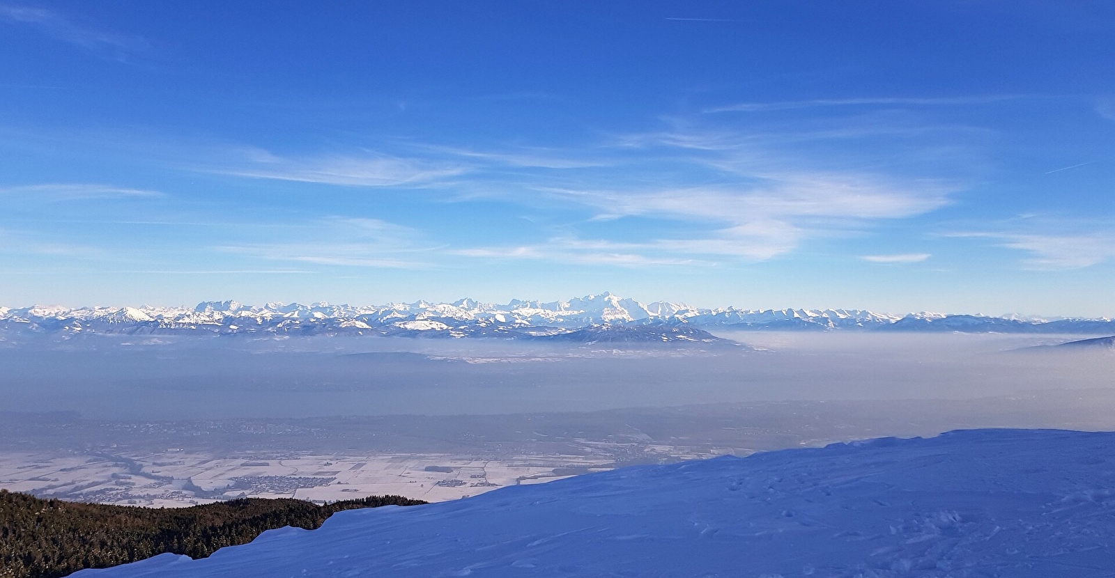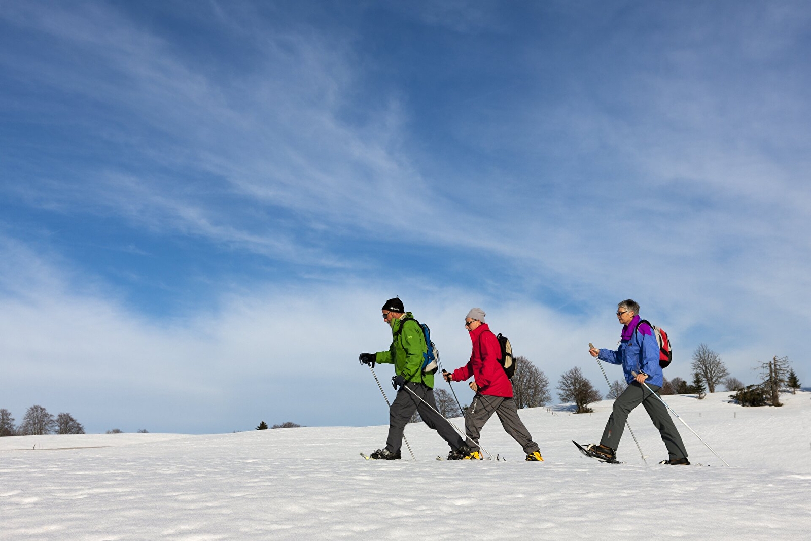 La Grande Traversée du Jura à raquettes : un itinéraire spécifique, adapté à ce moyen de locomotion ! Se faufiler entre 2 épicéas pour déboucher dans une clairière, vaste combe qui se prolonge au loin par la vue sur les Monts Jura. Reliefs qui s’adoucissent avec la neige. L’hiver il n’y a pas de chemin, parfois une trace. L’itinéraire est balisé par de discrets rubans qui vous guideront de village en village.